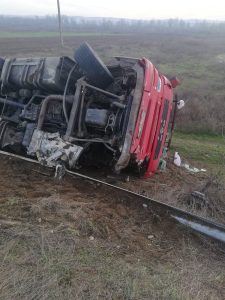 În accident au fost implicate două autoturisme şi un tir. Una dintre victime a fost încarcerată, pompierii reuşind s-o scoată în viaţă. Tirul s-a răsturnat, iar traficul rutier este parțial blocat.