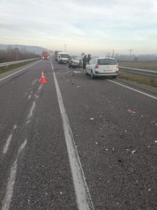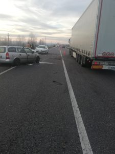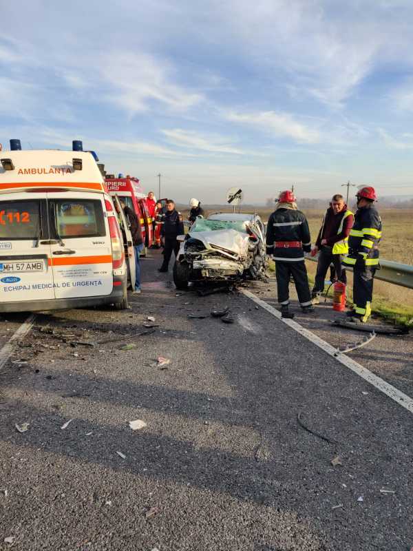 În accident au fost implicate două autoturisme şi un tir. Una dintre victime a fost încarcerată, pompierii reuşind s-o scoată în viaţă. Tirul s-a răsturnat, iar traficul rutier este parțial blocat.