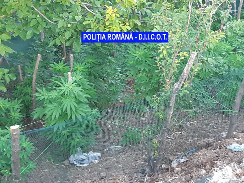 În locuințele percheziționate, a fost descoperită o cultură de cannabis outdoor formată din 64 de plante de cannabis, în diferite stadii de dezvoltare.