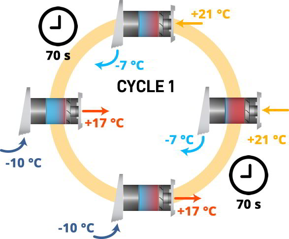 Ciclul 1. Aerul cald este extras din interior si este pastrat in schimbator timp de 70 de secunde, pana incalzeste elementele ceramice ale acestuia.