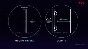 Tehnologia OD Zero de la TCL folosește LED-uri mai mici și are un sistem și design nou de lentile, cu mai multe surse de lumină, ceea ce a permis micșorarea distanței dintre sursa de lumină și panou la cifra impresionantă de 0 milimetri. Acest lucru îmbunătățește consistența luminozității și, în același timp, atinge un nou nivel de densitate, făcând posibilă apariția, în premieră, a unui profil TV ultra subțire, cu un aspect vizual de impact și o calitate de excepție.