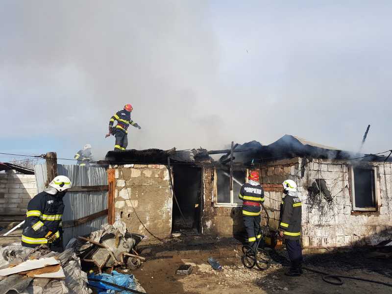 În aceste momente, pompierii mehedințeni intervin pentru stingerea unui incendiu izbucnit la o anexă gospodărească în orașul Vânju Mare.