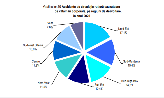 Statisticile INS arată că în anul 2020, comparativ cu 2019, numărul persoanelor rănite în accidente rutiere a scăzut cu 29,6%, cel al accidentelor de circulaţie rutieră cauzatoare de vătămări corporale cu 26,7%, iar cel al persoanelor accidentate mortal a scăzut cu 11,7%. Cea mai mare scădere, respectiv cu 32,3%, s-a înregistrat la numărul accidentelor între un vehicul ṣi un pieton. În cursul anului 2020 s-au înregistrat 22.836 accidente de circulaţie rutieră, soldate cu victime. În urma lor, 29.571 de persoane au fost accidentate, iar dintre acestea 1.646 au murit.