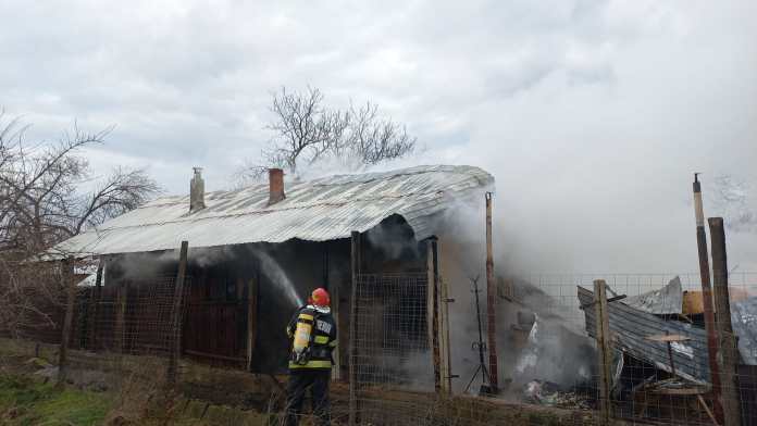 În aceste momente, pompierii mehedințeni intervin pentru stingerea unui incendiu izbucnit la o anexă gospodărească în orașul Vânju Mare.