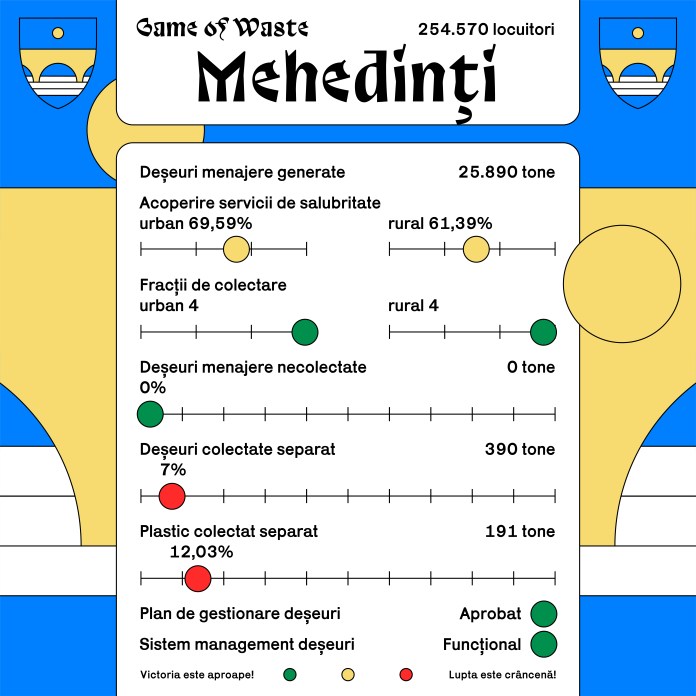 Cifrele au fost extrase din Planul Județean de Gestionare a Deșeurilor (PJGD). Potrivit acestuia, în județul Mehedinți au fost generate 25.890 tone deșeuri menajere, cea mai redusă cantitate comparativ cu celelalte 11 județe riverane Dunării. Cifrele raportate pot fi însă influențate și de acoperirea redusă a serviciilor de salubritate în județ, doar 65%.