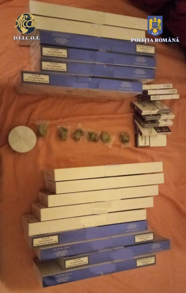 Potrivit unui comunicat, în urma percheziţiilor domiciliare efectuate, polițiștii au ridicat, în vederea continuării cercetărilor, peste 38.950 de ţigarete netimbrate, 20 de telefoane mobile, cu cartelele SIM aferente, 12 pliculeţe cu fragmente vegetale, 4 grindere, un pistol cu glonţ, de calibru de 9 mm, cu 6 cartuşe aferente, un pistol cu aer comprimat, 10 comprimate de xanax, un cântar de precizie și 4.050 de lei.