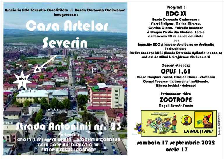 Asociaţia Arte Educaţie Creativitate şi Banda Desenată Craioveană, în parteneriat cu GREN – Grupul Român de Educaţie Nouă (Lien), PVR – Parteneriat Village Roumain Belgia, Asociaţia Cordelia şi Casa Corpului Didactic Mehedinţi îi invită pe toţi iubitorii de cultură la inaugurarea Casei Artelor din Drobeta-Turnu Severin.