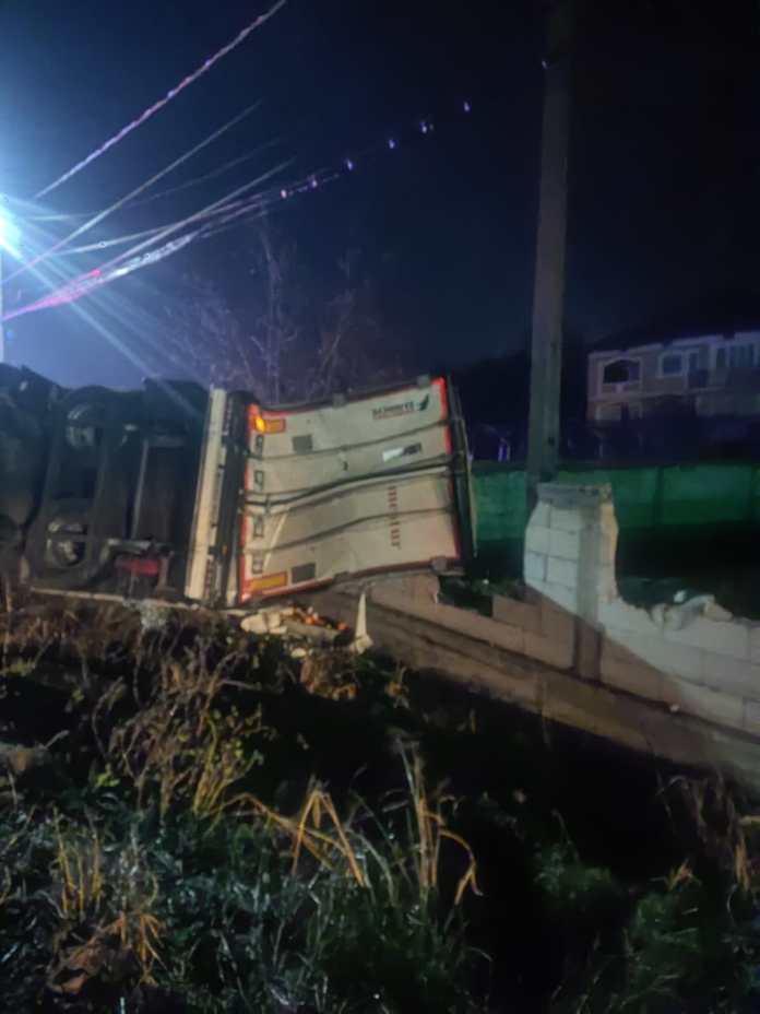 Conducătorul unui autotren încărcat cu cereale a pierdut controlul direcției de mers și s-a răsturnat pe suprafața carosabilă. Circulația rutieră este blocată pe ambele sensuri de mers. Nu au rezultat victime.