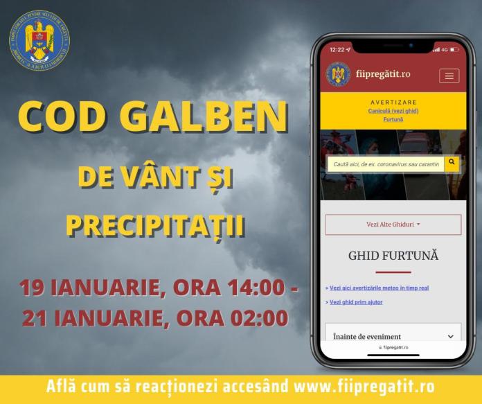 De asemenea, în intervalul 19 ianuarie, ora 14:00 – 21 ianuarie, ora 2:00, va fi în vigoare un Cod galben de precipitaţii, intensificări ale vântului în zona montană şi local în nordul Olteniei, unde se vor acumula cantităţi de precipitaţii în general de 25-40 litri/mp. Pe parcursul zilei de joi va ploua şi doar la altitudini de peste 1.700 metri se vor semnala precipitaţii mixte, iar începând de vineri dimineaţa, treptat vor predomina ninsorile în cea mai mare parte a zonei montane şi se va depune strat de zăpadă.