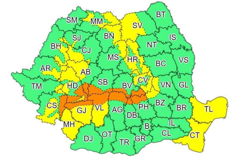 Judeţele vizate de avertizarea Cod portocaliu sunt: