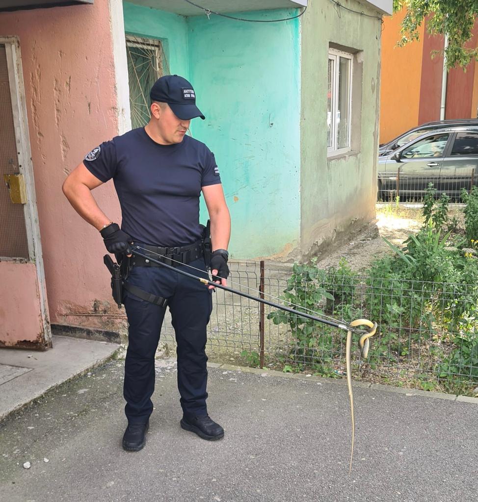 Un șarpe de peste un metru a fost ridicat de jandarmi din fața unui bloc din municipiul Drobeta Turnu Severin.
