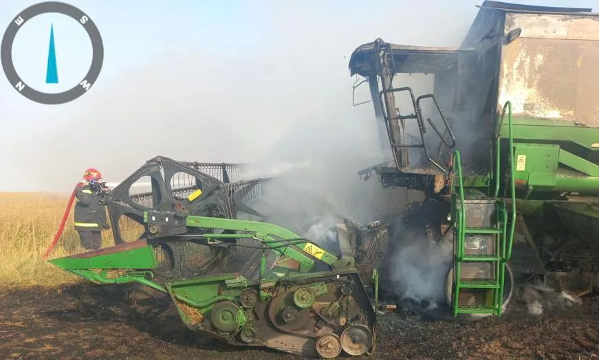 O combină aflată într-un lan s-a făcut scrum în urma unui incendiu declanșat cel mai probabil de un scurtcircuit.