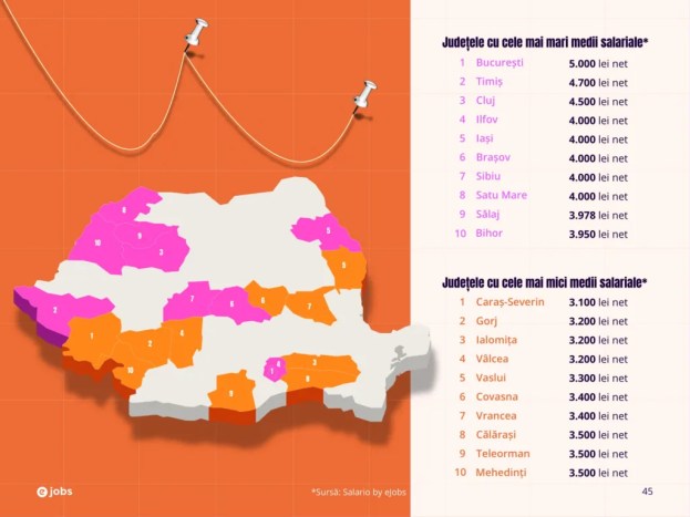 Datele oferite de platforma de recrutare pentru tot anul 2023 schimbă clasamentul oficial, publicat în vară de INS. Însă datele sunt mai limitate, fiind disponibile doar cele oferite de angajaţii încrişi în platformă. Astfel, Gorjul şi Vâlcea se află pe al doilea loc în privinţa celor mai mici medii salariale, cu 3200 lei net, iar Mehedinţi pe locul 10, cu 3500 lei net, conform datelor oferite de 700.000 de salariaţi din ţară înscrişi în aplicaţia Salario.