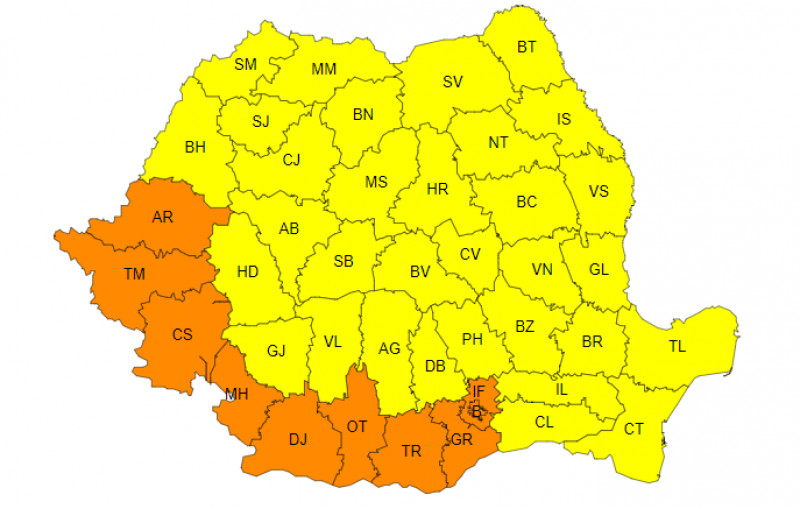 Judeţele Arad, Timiş, Caraş-Severin, Mehedinţi, Dolj, Olt, Teleorman, Giurgiu, Ilfov, precum şi în municipiul Bucureşti se vor afla sub avertizare cod portocaliu.