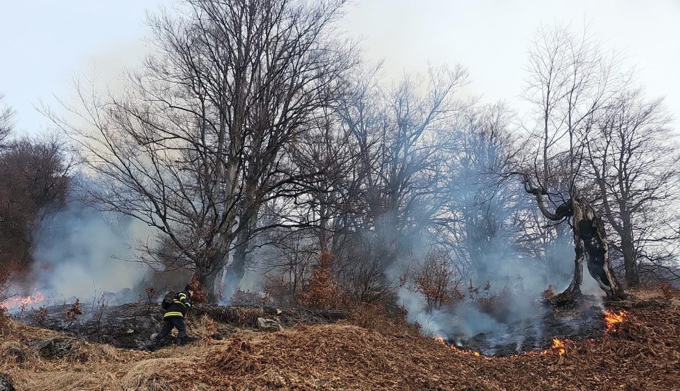 Pompierii mehedințeni continuă să stingă incendiul la litiera de pădure și vegetație uscată izbucnit, ieri, în localitatea Isverna.