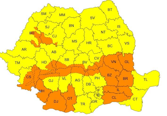 Una dintre avertizările cod portocaliu vizează total sau parțial județele Cluj, Bihor, Hunedoara, Caraș-Severin, Mehedinți, Gorj, Alba, Sibiu, Dolj, Olt, Vâlcea, Brașov, Argeș, Dâmbovița, Prahova, Covasna, Vrancea, Galați, Buzău, Brăila, Ialomița și Călărași, spun meteorologii.