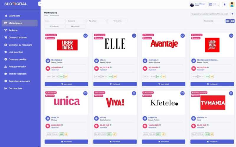 Creată pentru marketeri, antreprenori, agenții și creatori de conținut, SEO Digital reunește într-un singur dashboard întregul proces de publicare advertoriale – de la selecția publicațiilor până la programarea articolelor și monitorizarea linkurilor după publicare. Platforma oferă acces la sute de publicații românești din domenii variate, precum business, sănătate, lifestyle, tehnologie, auto, educație și multe altele.