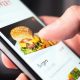 Food delivery app order with phone. Online mobile service for take away burger and pizza. Hungry man reading restaurant menu, website and reviews with smartphone. Takeout...